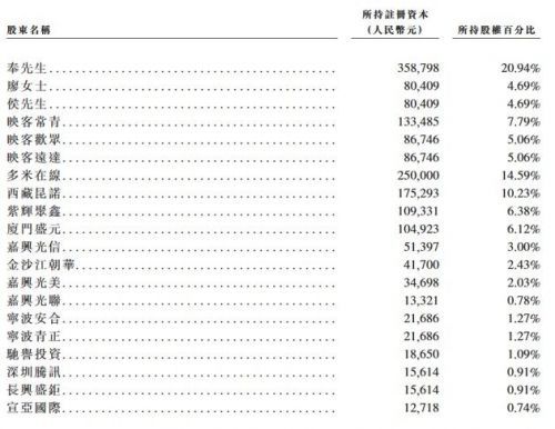 映客创始人奉佑生持股为20.94%,首席运营官廖洁鸣与首席技术官侯广凌各直接持股4.69%。这三位都是映客董事会成员。