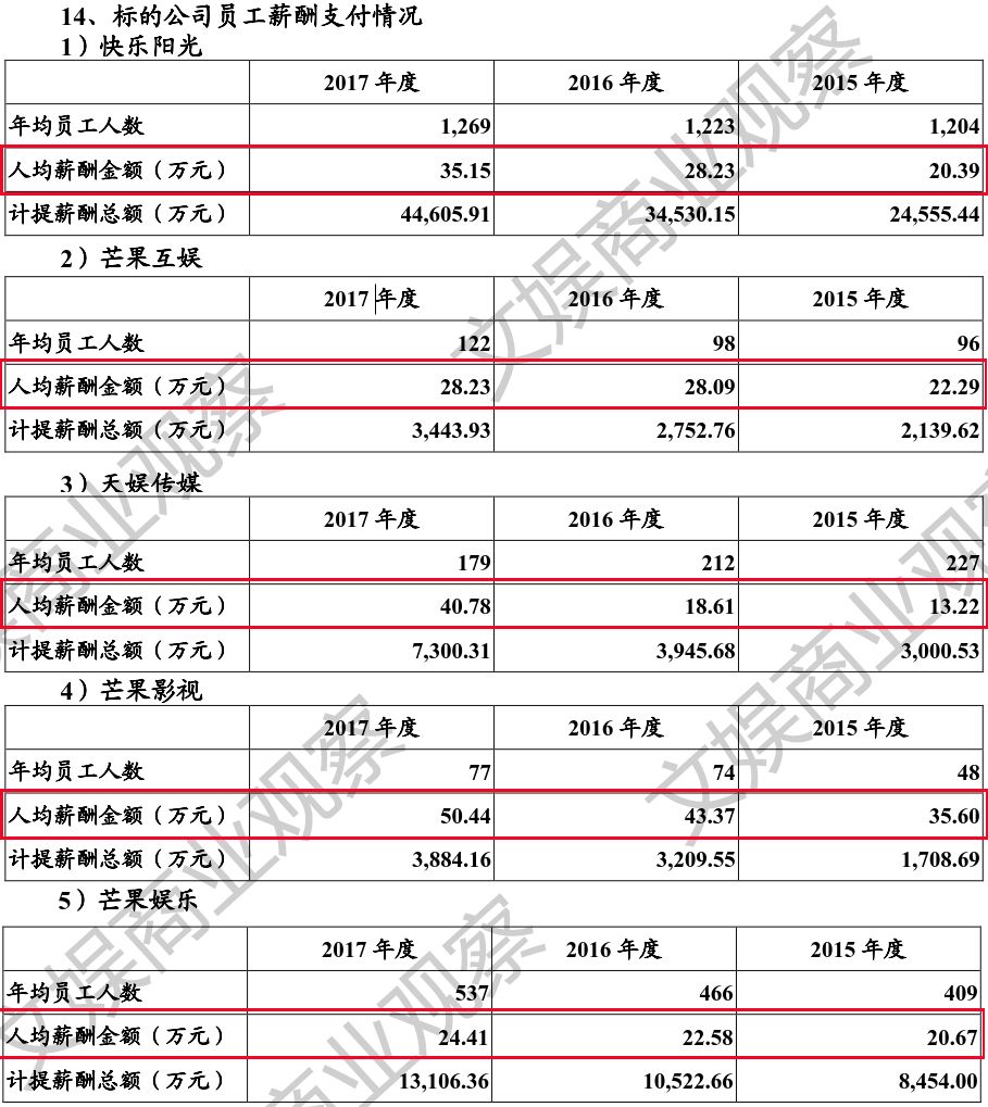 在去年文娱商业观察的影视公司平均工资的排行榜文章中,2016年上市类影视公司的人均年工资为17万元,百分之九十以上都低于30万年薪,把芒果系的平均年薪和上市类影视公司年薪相比,还是明显高的。