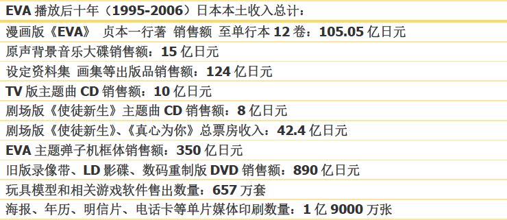 从上表看,漫画版销售收入是属于贞本义行和漫画公司的;音乐大碟销售是唱片公司的;录像带和LD、DVD,大头是入股的发行商拿;玩具模型这块收入,不用说自然是玩具公司的;而海报、明信片等印刷品,是广告公司转手销售给其他企业使用权的。外销的电视播映权收入和剧场版票房,那是属于整个制作委员会的。除去这些,动画的制作公司GAINAX自己能支配的收入,就是画集等出版品的利润,以及它拥有主要版权的相关游戏软件销售获益。