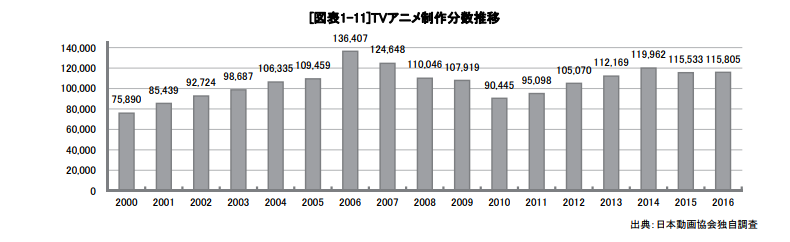 2000-2016年日本TV动画制作分钟数统计