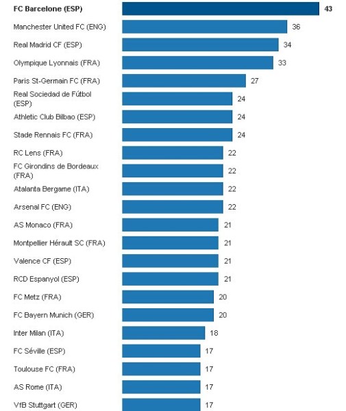 近日,权威数据评估机构——国际体育研究中心(CIES)公布了一份关于欧洲五大联赛(英超、西甲、德甲、意甲和法甲)球队青训排行的统计分析报告。其中,巴萨拉玛西亚青训营以贡献43名球员排名榜首,曼联(36人)、皇马(34人)、里昂(33人)、巴黎圣日耳曼(27人)分列2-5位。