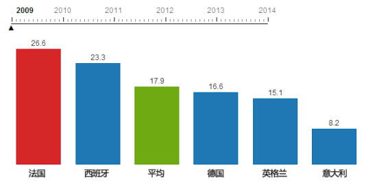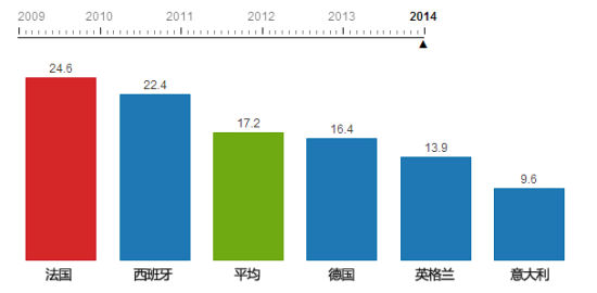 数据显示,在五大联赛使用自家青训球员的比例统计上,2014年法甲联赛使用自家青训球员比例达到了24.6%排名第一,西甲以22.4%紧随其后。2014年欧洲各大联赛使用青训球员的平均比例为17.2%,德甲(16.4%)、英超(13.9%)和意甲(9.6%)均低于欧洲的平均水平。将这一数据与2009年的数据相比不难看出,在5年的时间里,五大联赛的青训球员使用比例都有所下降。