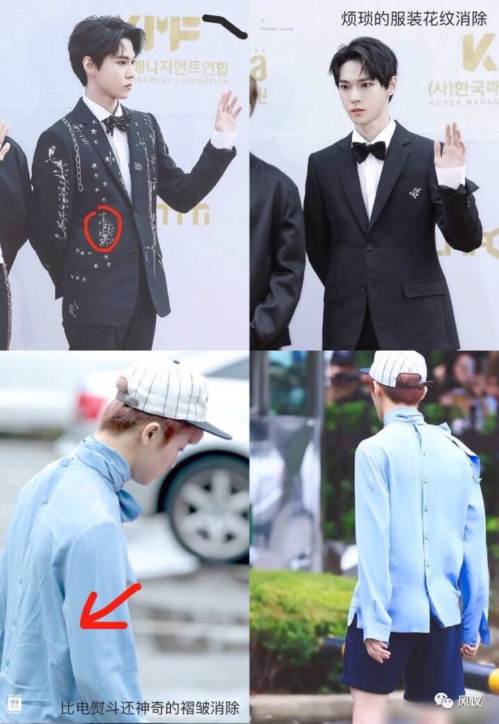 影响爱豆气质的那些乱七八糟的花纹还有褶皱,在站姐的消除笔下sou的一声就不见了,衣服的质感出来了,爱豆干净利落的形象也保住了。