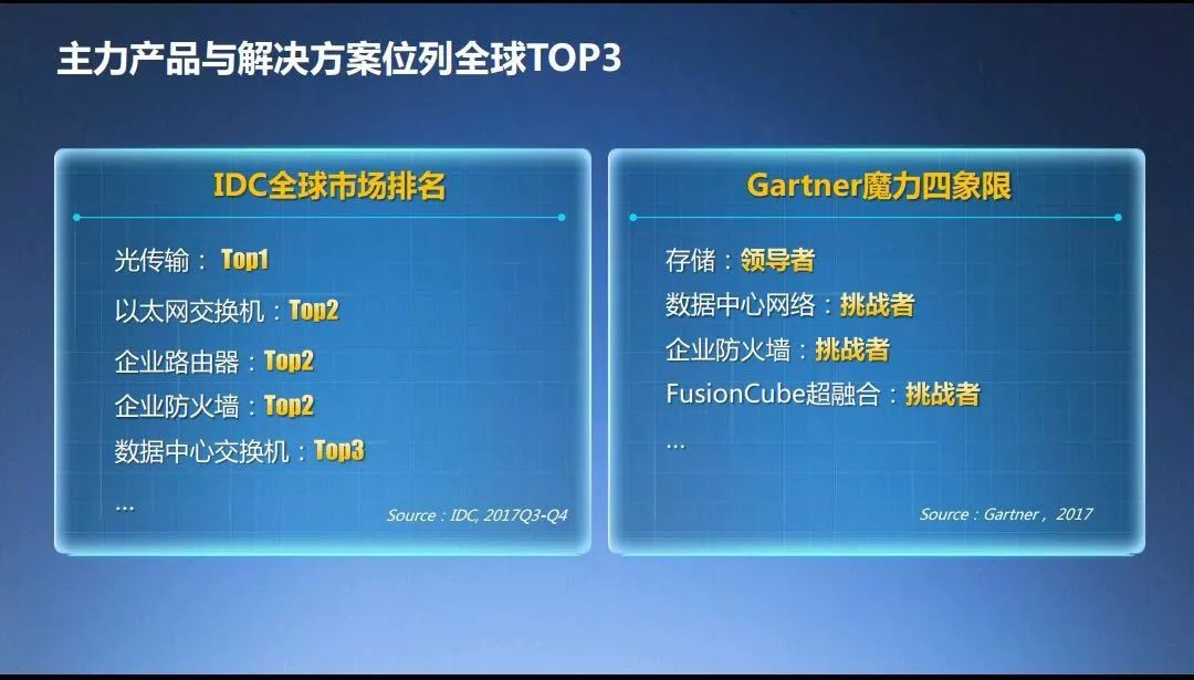 据Gartner系列魔力四象限报告显示,华为存储蝉联领导者象限位置,FusionCube超融合基础设施跃升挑战者象限。而IDC的报告显示,华为云政务云解决方案、华为云FusionInsight大数据解决方案在中国市场综合排名均获第一,华为云FusionAccess桌面云解决方案在中国市场销售排名第一。