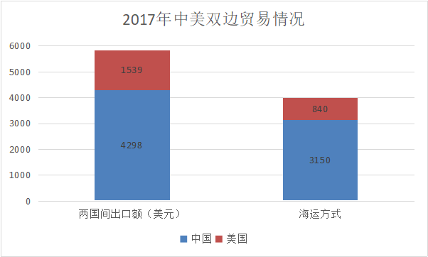 此次贸易战争端让人们重新审视中美双边贸易。数据显示,2017年中美双边贸易额约为5837亿美元,在这一双边贸易总额里,中国对美国出口主要是中低端制造领域,进口则主要是农产品和高端制造,海运是重要的贸易运输方式。