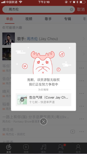 “抱歉,该资源暂无版权,我们正在努力争取中。”打开手机中的网易云音乐,吴静(化名)抱着希望再次点击了自己收藏的周杰伦歌曲,可弹出的依然是上面这句话。