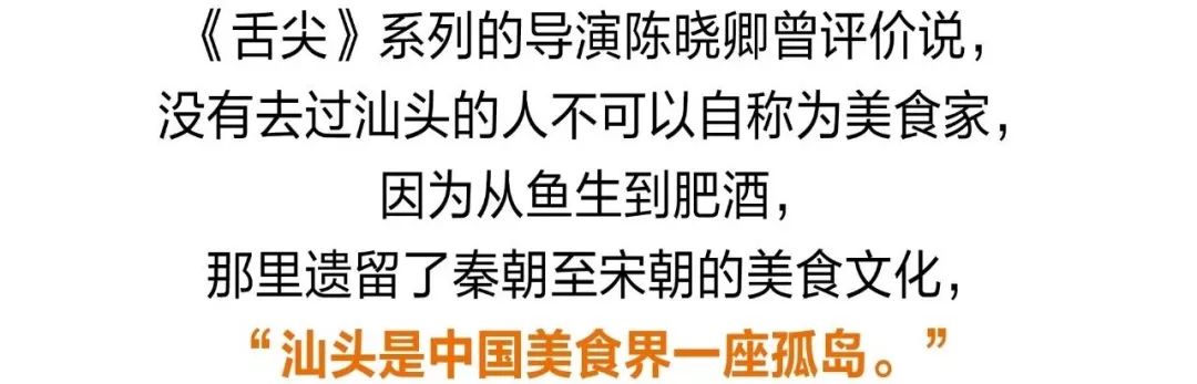 《舌尖》系列的导演陈晓卿曾评价说,没有去过汕头的人不可以自称为美食家,因为从鱼生到肥酒,那里遗留了秦朝至宋朝的美食文化,“汕头是中国美食界一座孤岛。”