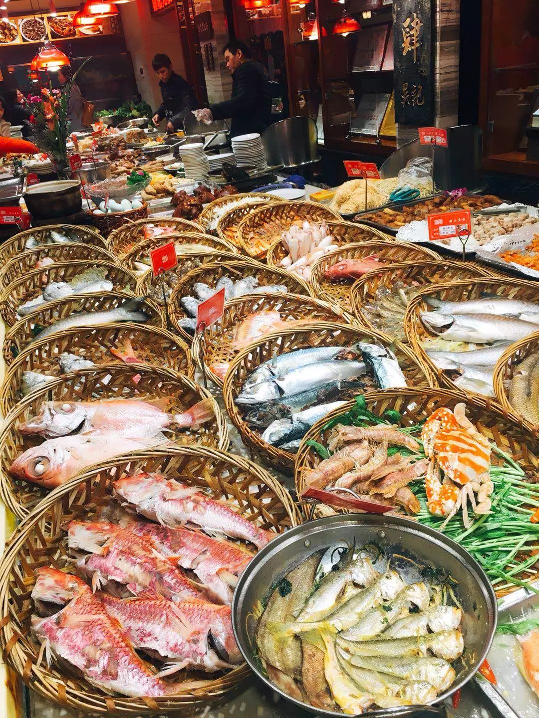 这里完全没有菜单,所有的菜式全部都以明档方式摆放出来,各种生食熟食完全展现眼前,看见什么点什么。有时刚坐到位子上,所要的菜肴已然送到餐桌。