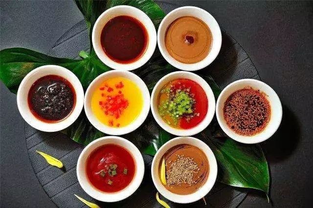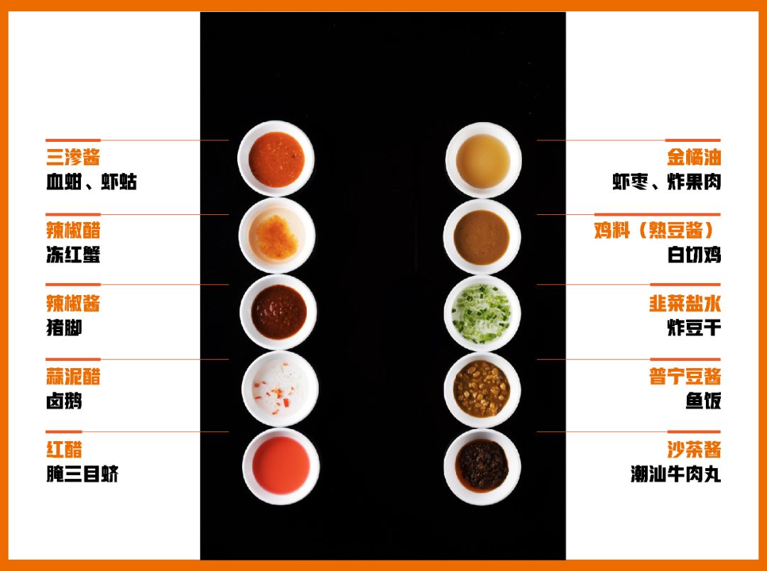 潮菜特别重视配酱调味,酱碟佐料多,咸、甜、酸、香、辣各有讲究。无论是大菜或小吃,基本每道菜都必配以相应的蘸料,如生腌海鲜必配桔油、冻蟹必配姜末醋、卤鹅必配蒜泥醋、烧鹅必配梅膏等等。不同菜色配以不同酱碟,一菜一碟,餐桌上必是蔚为壮观。