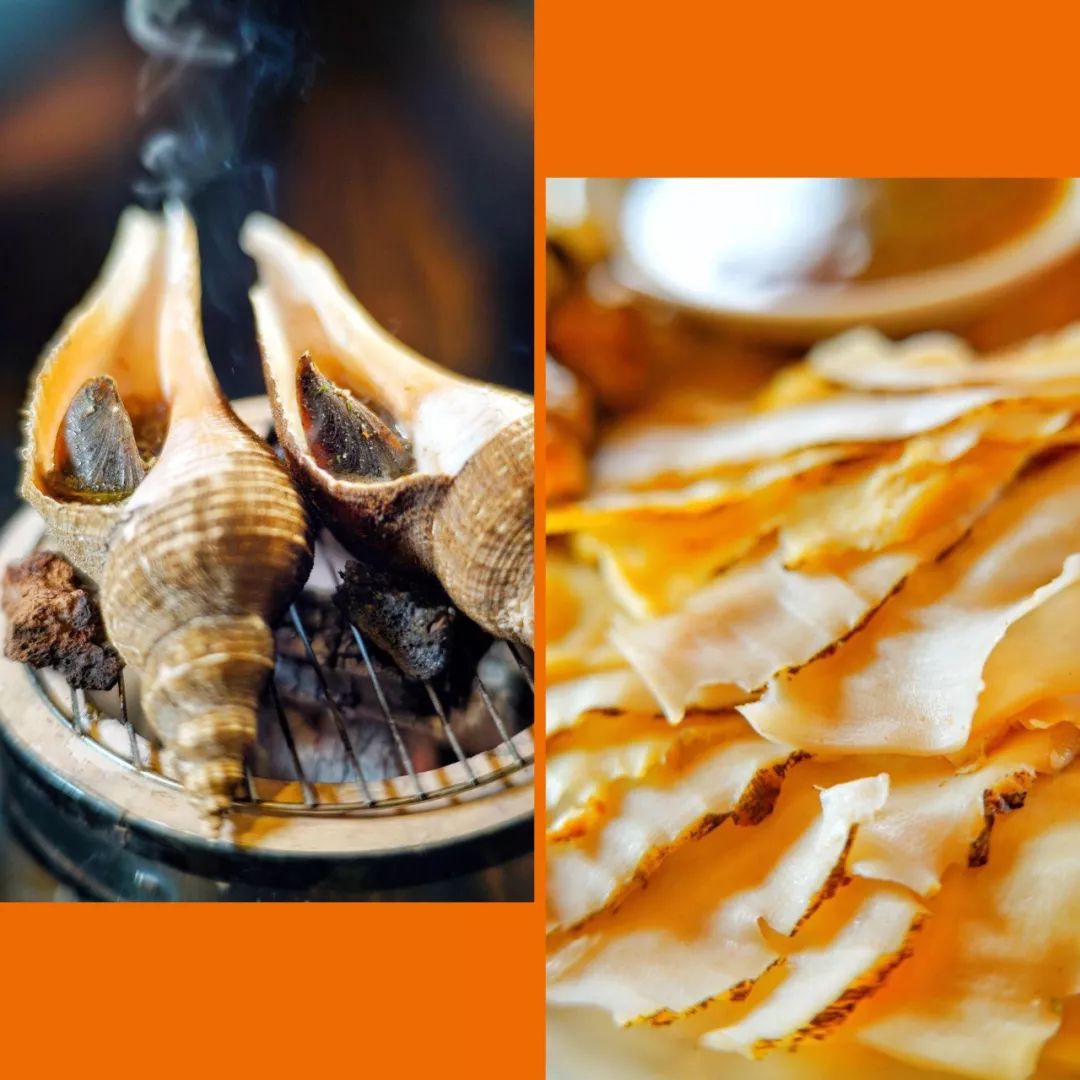 响螺属于高档潮州菜式,带壳的活响螺架上碳火烤40分钟后,去除螺肠后切片装盘。烧好的响螺片吃起来就像溏心干鲍,柔韧味浓,余香满口。