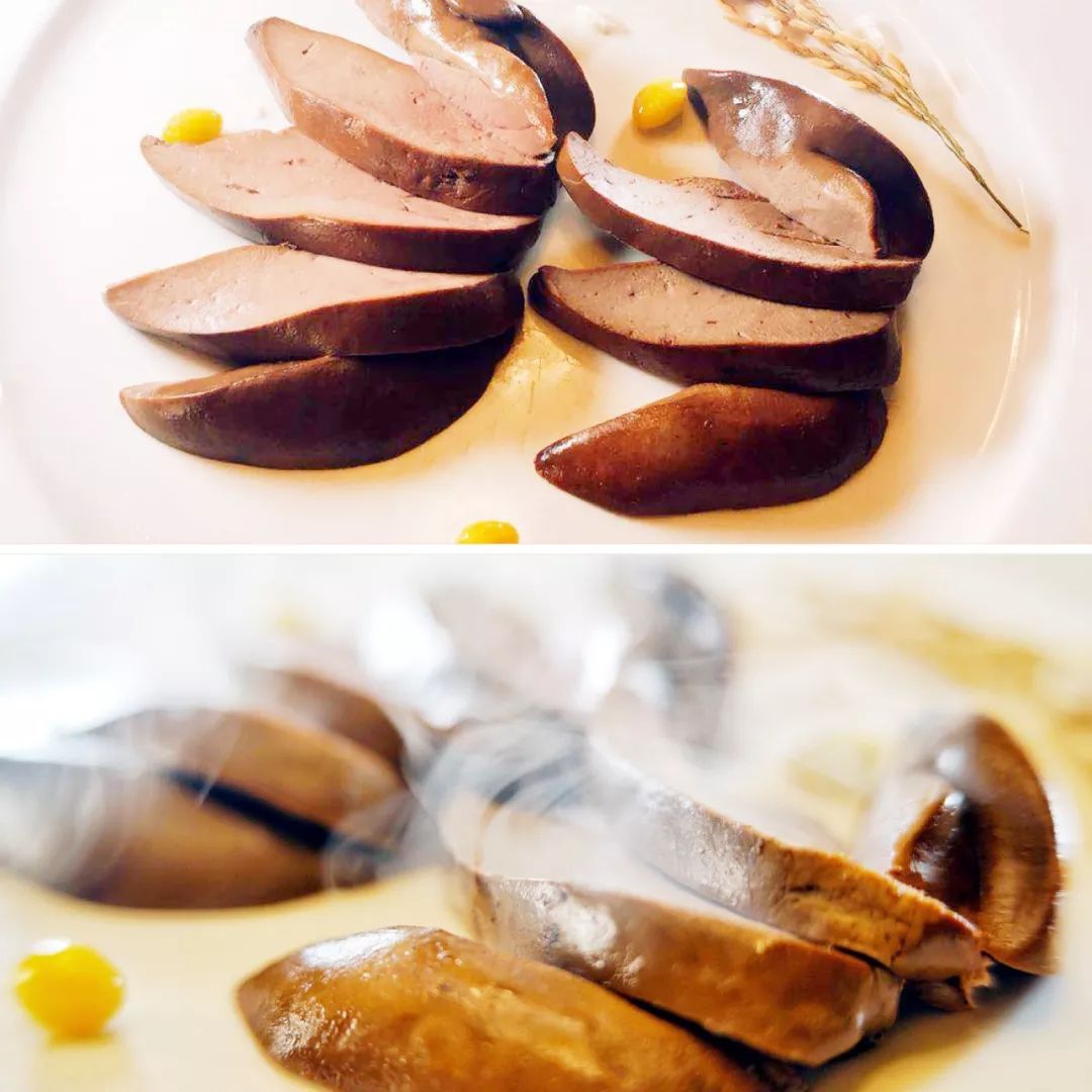 这里的鹅肝是以潮菜传统烟薰鸭脯的手法,先将鹅肝卤至将熟,再将鹅肝冷薰表面至金黄。鹅肝外表是棕黄,有非常鲜明的烟熏味道,相对于传统的卤水鹅肝更加明快净爽。