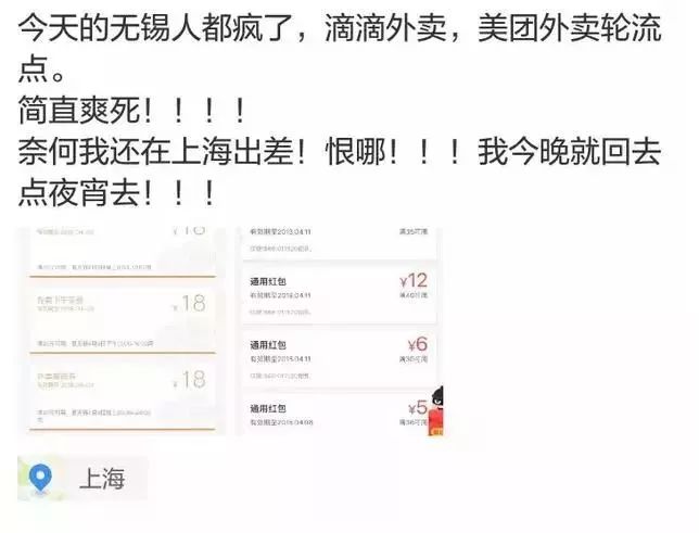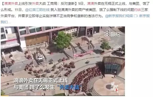 4月初,外卖之战在无锡打响,美团紧急调拨200骑士奔赴无锡支援配送业务,一时间外卖的争夺战进入白热化。有的商家仅仅靠补贴,一天收入几千元,简直在撒钱,美团外卖、饿了么也加入补贴大战。后美团外卖、饿了么、滴滴外卖被相关部门紧急约谈,外卖补贴战,暂时告一段落。