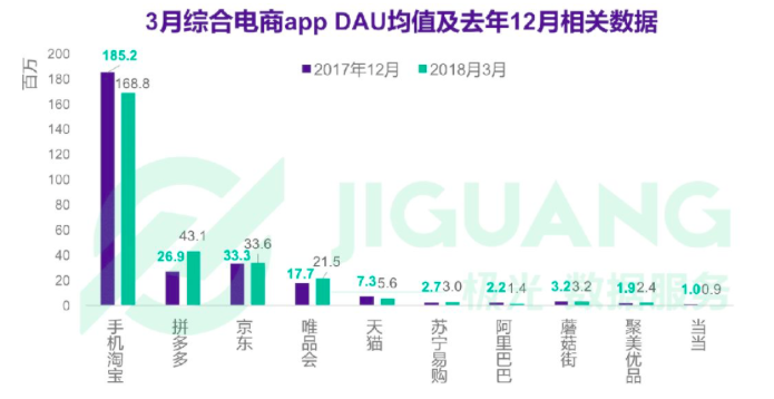 而在3月综合电商APP的DAU数据中,拼多多以约4310万的日活用户排在第二位,京东约3360万的日活用户排第三位。