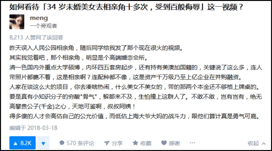 知乎上有人问“如何看待34岁未婚美女去相亲角多次,受到百般侮辱”这一视频?”
