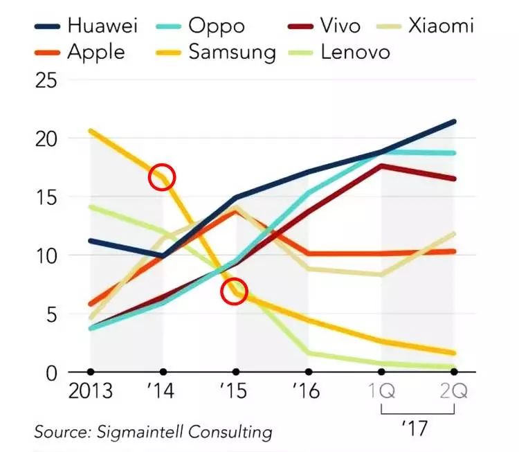 手机爆炸的阴云笼罩着三星,两年久久未散去。这一影响直接导致三星之后在中国手机市场萎靡不振,Strategy Analytics 的最新数据报告显示,2017 年第 4 季度三星的市场占有率仅为 0.8%,颇有要成为「第二个 1%」的架势。纵观 2017 年全年,三星在中国市场的占有率也仅为 2.1%。要知道在鼎盛时期,2013 年的三星曾霸占超过 30% 的中国市场份额。昔日霸主如今落得这番田地,不禁令人唏嘘。