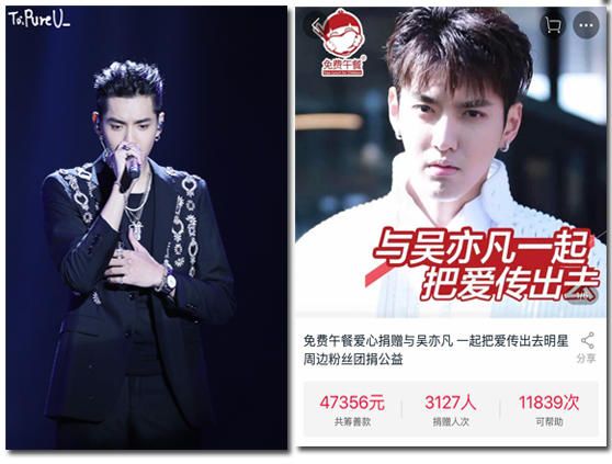 比如,PureU_Kris吴亦凡个站携手免费午餐开启爱心捐赠通道,仅仅两周筹得善款四万七千余元,共计可为11839为贫困学童提供营养丰富的午餐;Fanbaobao_吴亦凡宝宝站与PureU_Kris吴亦凡个站联合中华少年儿童慈善救助基金会在河北省张家口市赤城县大海陀乡捐建了27座爱心图书室。