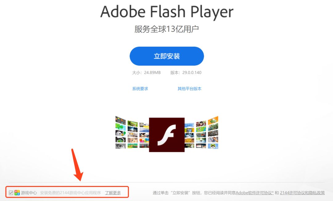 在距离 Flash Player (即 Flash 浏览器插件)彻底退役不到两年的时候,仍有需要单独安装 Flash Player 的中国用户发现了一个奇怪的现象:Windows 版官方安装程序,会默认捆绑安装名叫“2144 游戏中心”的软件 。