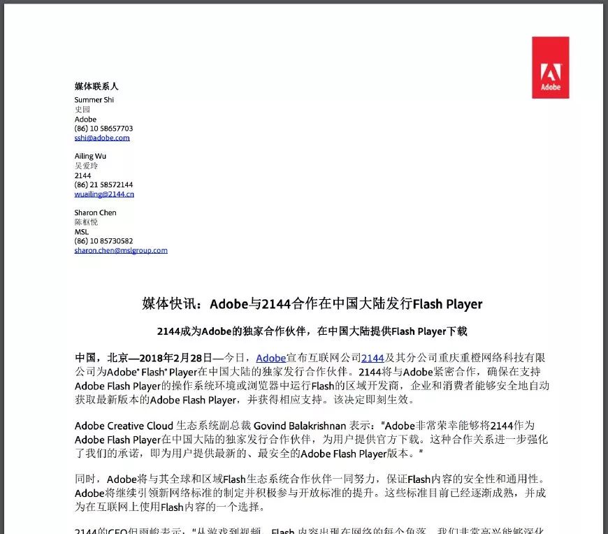 当然,人们的第一反应是自己被DNS劫持了,或者至少这个2144小游戏是假托官方名义。直到2018年2月28日,Adobe官网发布的新闻稿证实“互联网公司2144及其分公司重庆重橙网络科技有限公司,为Adobe Flash Player在中国大陆的独家发行合作伙伴”,终结了所有的猜测。