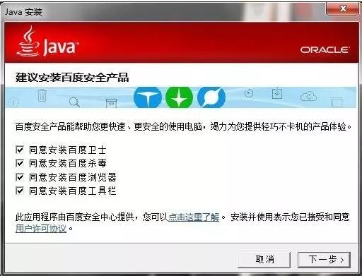 2015年1月25日开始,甲骨文和百度之间达成战略合作关系,向Java用户推荐安装百度安全产品。Java 8 Update 31版本会默认勾选安装百度卫士、百度浏览器、百度杀毒和百度工具栏。
