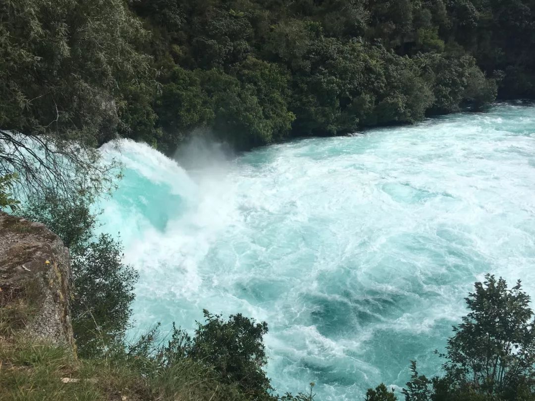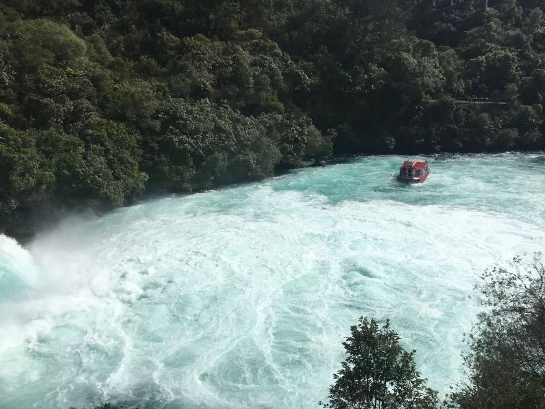 浅蓝如宝石的怀卡托河突然收紧,有了落差,产生喷射及向下的巨大动力,形成泡沫般的水瀑宣泄而下,故当地人称此瀑布为“Huka”,在毛利语里,是泡沫的意思,对的,不ps,就是这么蓝!真的很夸张~