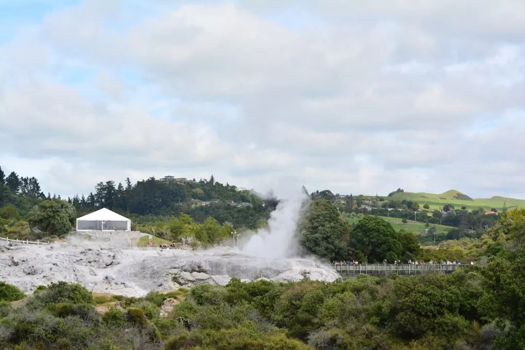 更让花花惊喜的是,我们遇见了间歇泉的喷发,实在太幸运了!大家在参观的时候也可以在观景平台上坐着休息,看看运气。两大间歇泉,正在喷发的这个威尔士亲王的羽毛是新西兰最活跃的间歇泉,大概一小时就会喷发一次。