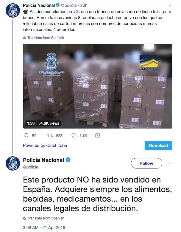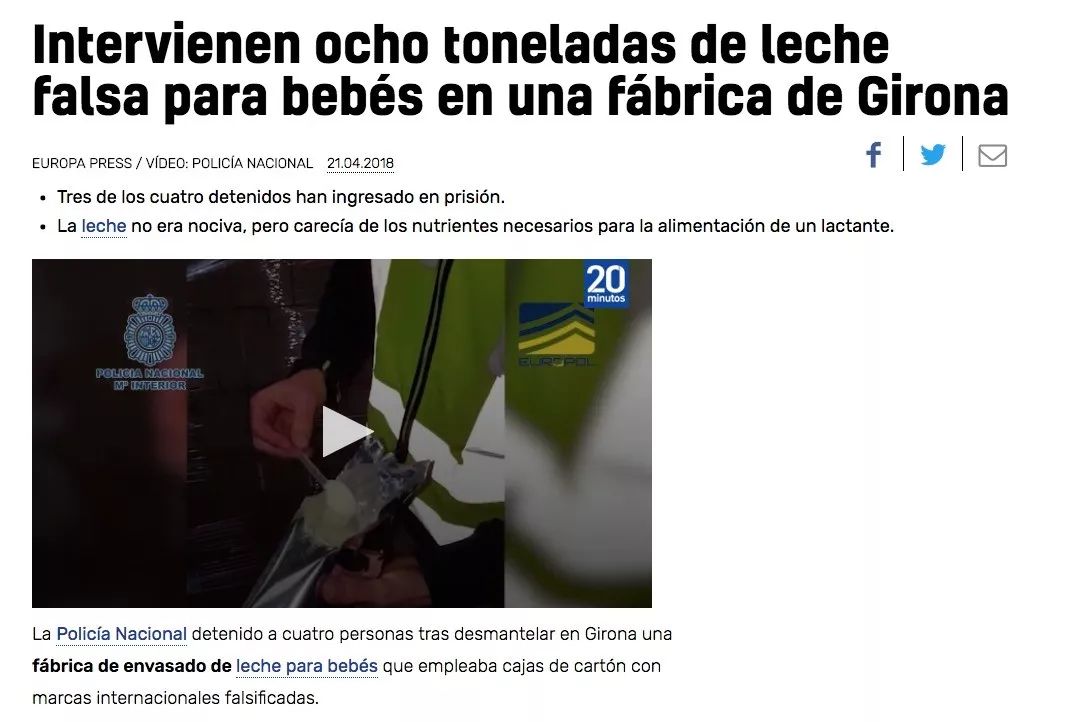 西班牙警方同时还发布了在涉事包装工厂查封假奶粉的片段(如下所示),各位可以自行点击观看。