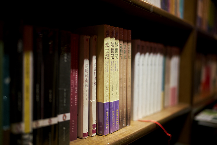 13. 老书虫书店里的图书约一半是中文书,一半是外文书。在室内灯光的照射下,书籍原本的颜色被覆盖了一层暖暖的黄色,一切都显得十分柔软安静。