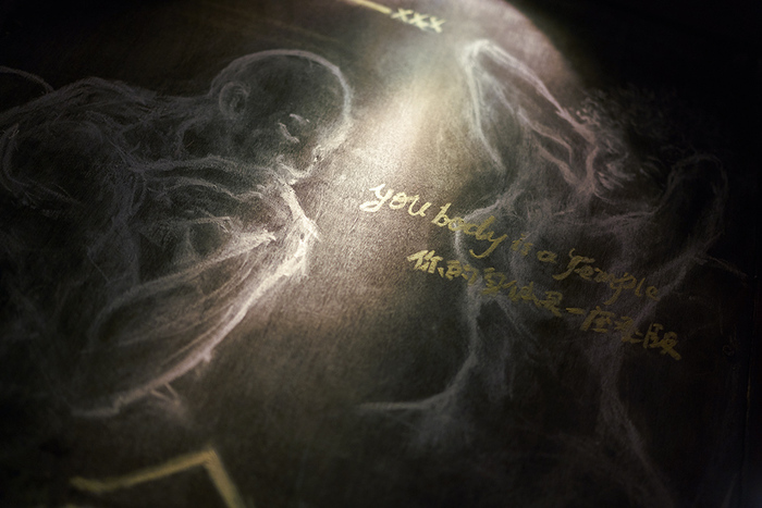 12. 书店的墙壁上用粉笔写着“身体是每一个人神殿”,旁边还有一副粉笔画的人体画。
