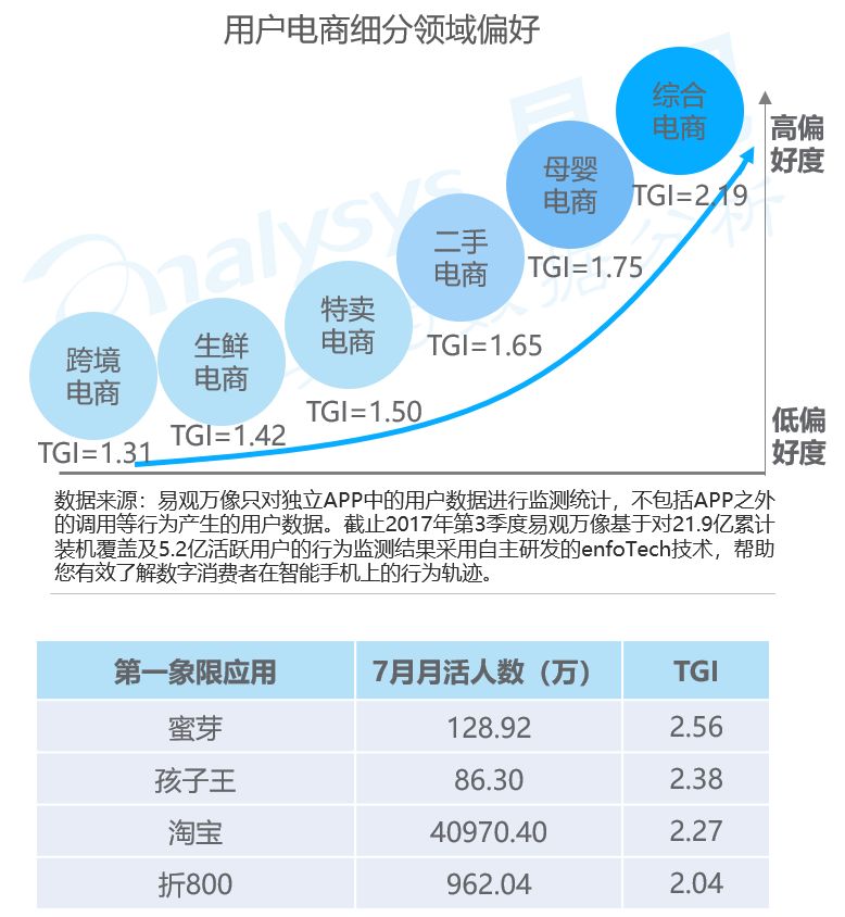 ▌用户消费偏好:偏好综合电商与母婴电商,二手电商和生鲜电商渗透率较高,用户人群广泛