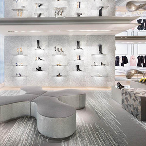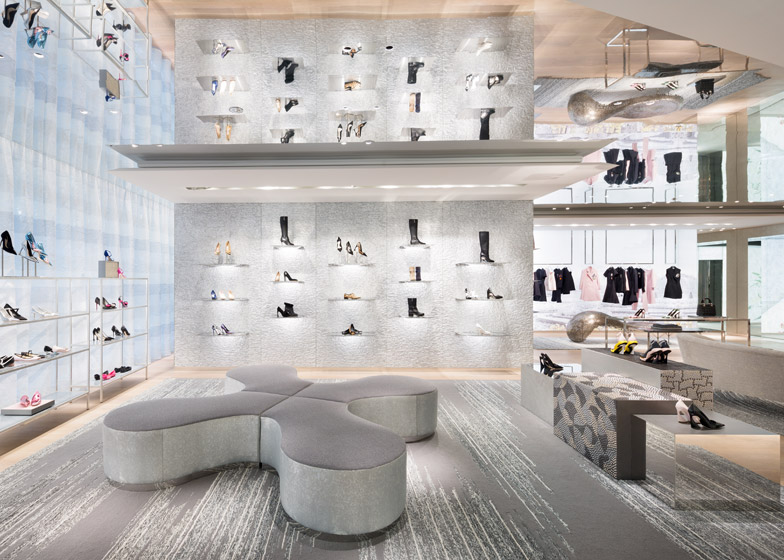 成衣商品线放在了有着开放空间的一层,该层还有浅色的镶木地板和灰色的地毯: