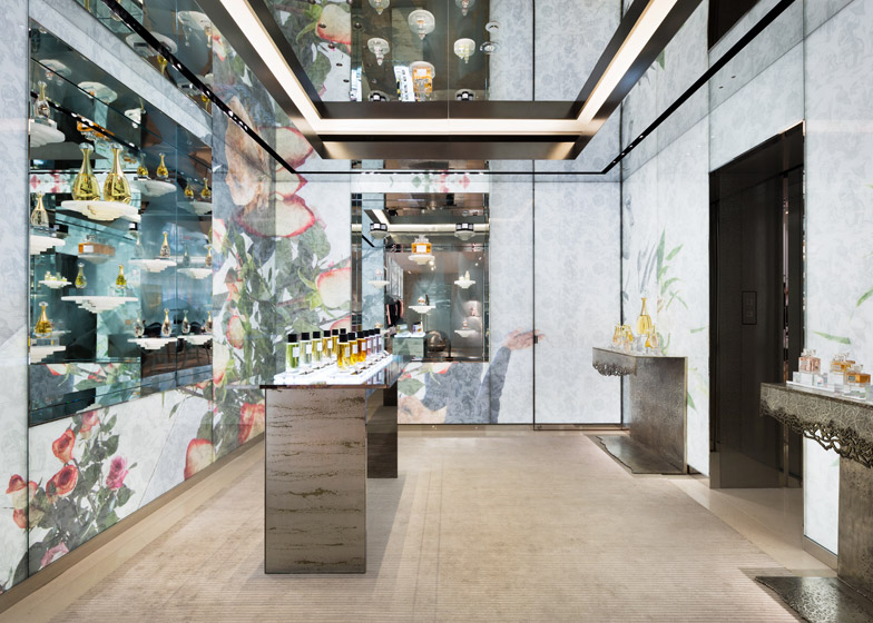 二层主要是女士服装和香水。层顶铺满了镜子,让整个空间看起来高了一倍。放香水的墙体也都装饰着玻璃,上面满满都是Tim Hailand所画的花朵: