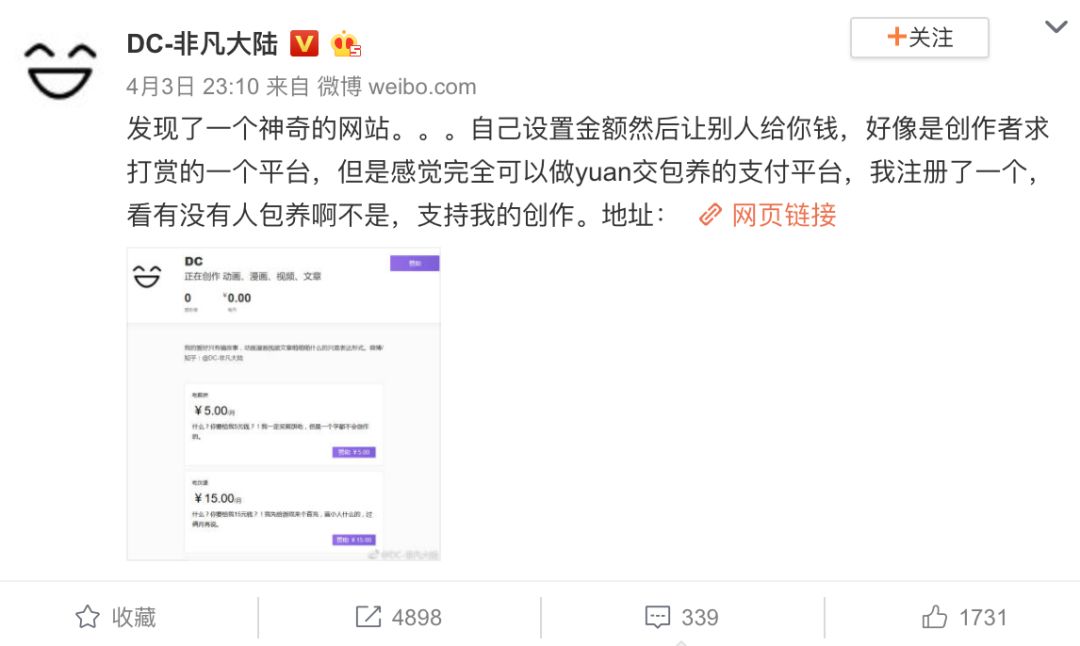 4月初,知名独立动画人@DC-非凡大陆 在微博上表示,他发现了一个创作者可以通过设置相应的金额,然后求粉丝打赏的神奇网站。随后,越来越多的ACGN相关内容的创作者纷纷在这个网站上开设主页,一是他们对这样的众筹网站的模式充满了好奇,二是抱着试试看的心情看有没有粉丝为他们充值打赏。