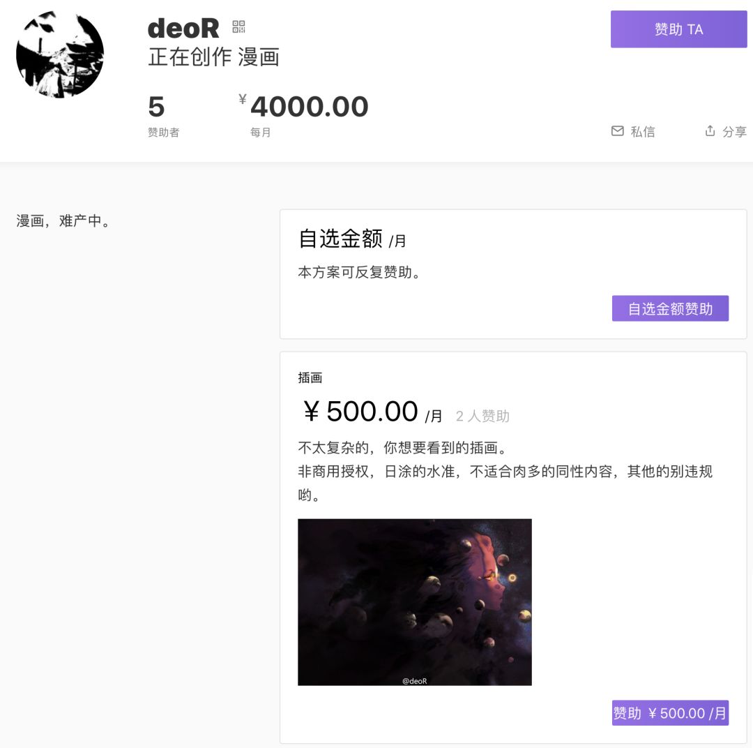 比如知名漫画、插画家@deoR 虽然赞助者只有5位,但他每个月却能从粉丝那边直接获得4000元的收入;