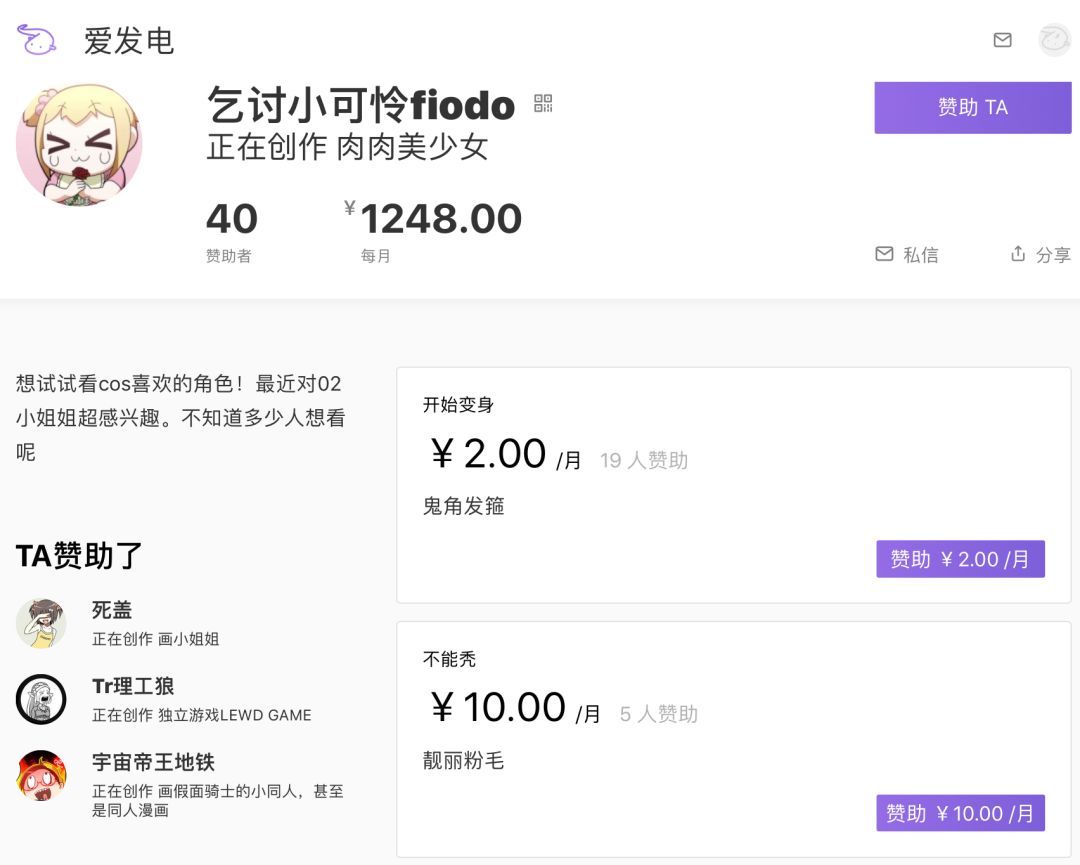 而一位微博粉丝超过28万的人气绘师@fiodo ,也能依靠40位赞助者,每个月获得1248元的收入;