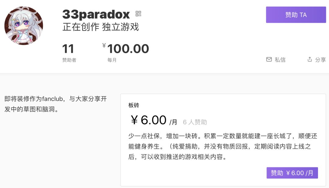不过在这个平台上,更多的创作者却无法达到这个水平。比如正在创作独立游戏的@33paradox ,每个月就只能从11位赞助者处获得100元的收入,与前文提到的知名创作者收入水平形成了强烈的反差。