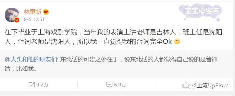 来自辽宁的九亿少女的梦——林更新实力验证了这种说法:“在下毕业于上海戏剧学院,当年我的表演主讲老师是吉林人,班主任是沈阳人,台词老师是沈阳人,所以我一直觉得我的台词完全Ok。”