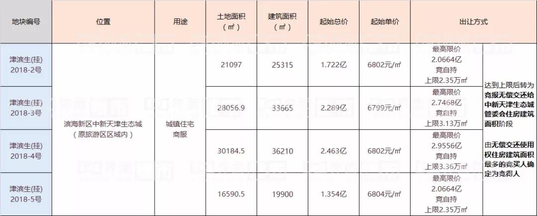 如图所示,四宗地块均设有最高限价,最高溢价率约为不超20%。其中需要着重注意的点是:出让公示显示,四宗地如若达到了竞自持上限,将转为竞报无偿交还给中新天津生态城管委会住房建筑面积阶段,由无偿交还使用权住房建筑面积最多的竞买人确定为竞得人。