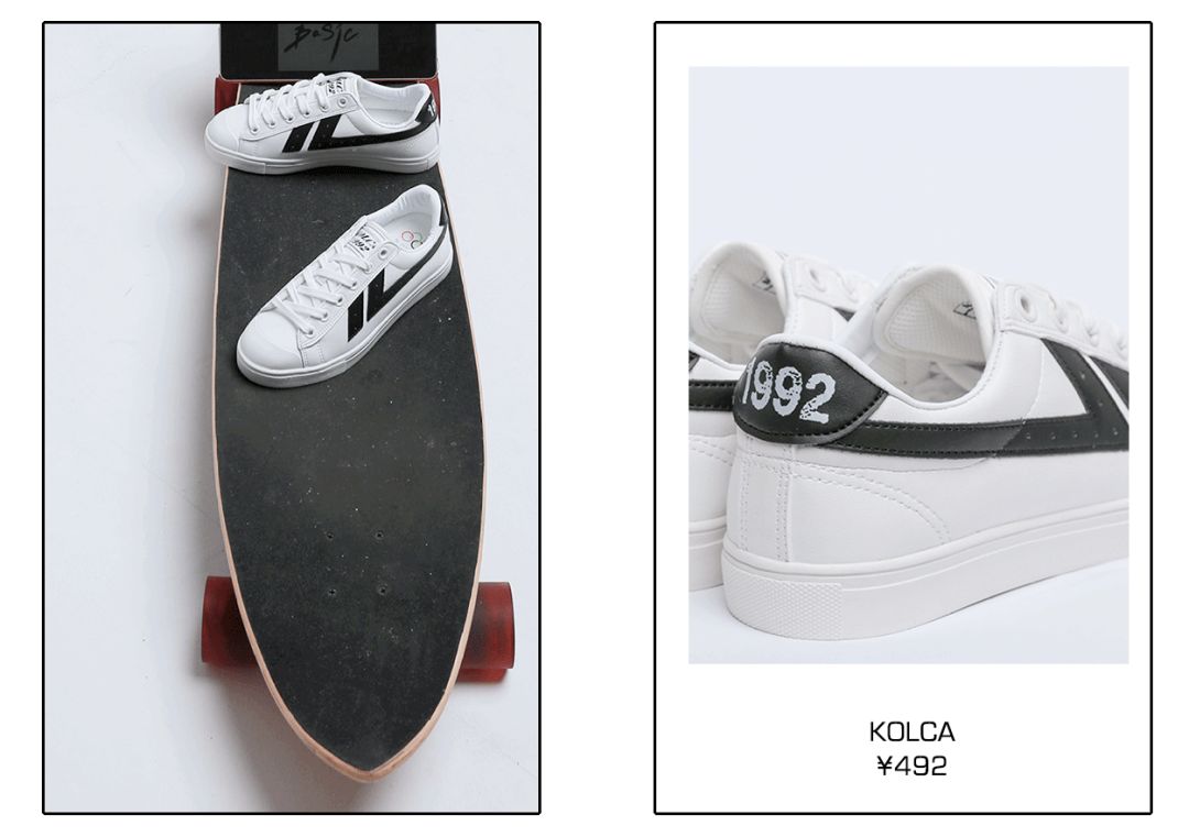 因为黑白色对比明显,所以就算鞋面只有品牌标志也装饰的话也很显眼。关注韩流的人应该很熟悉KOLCA这个牌子,它的标志很有几何艺术美感,非常帅气。