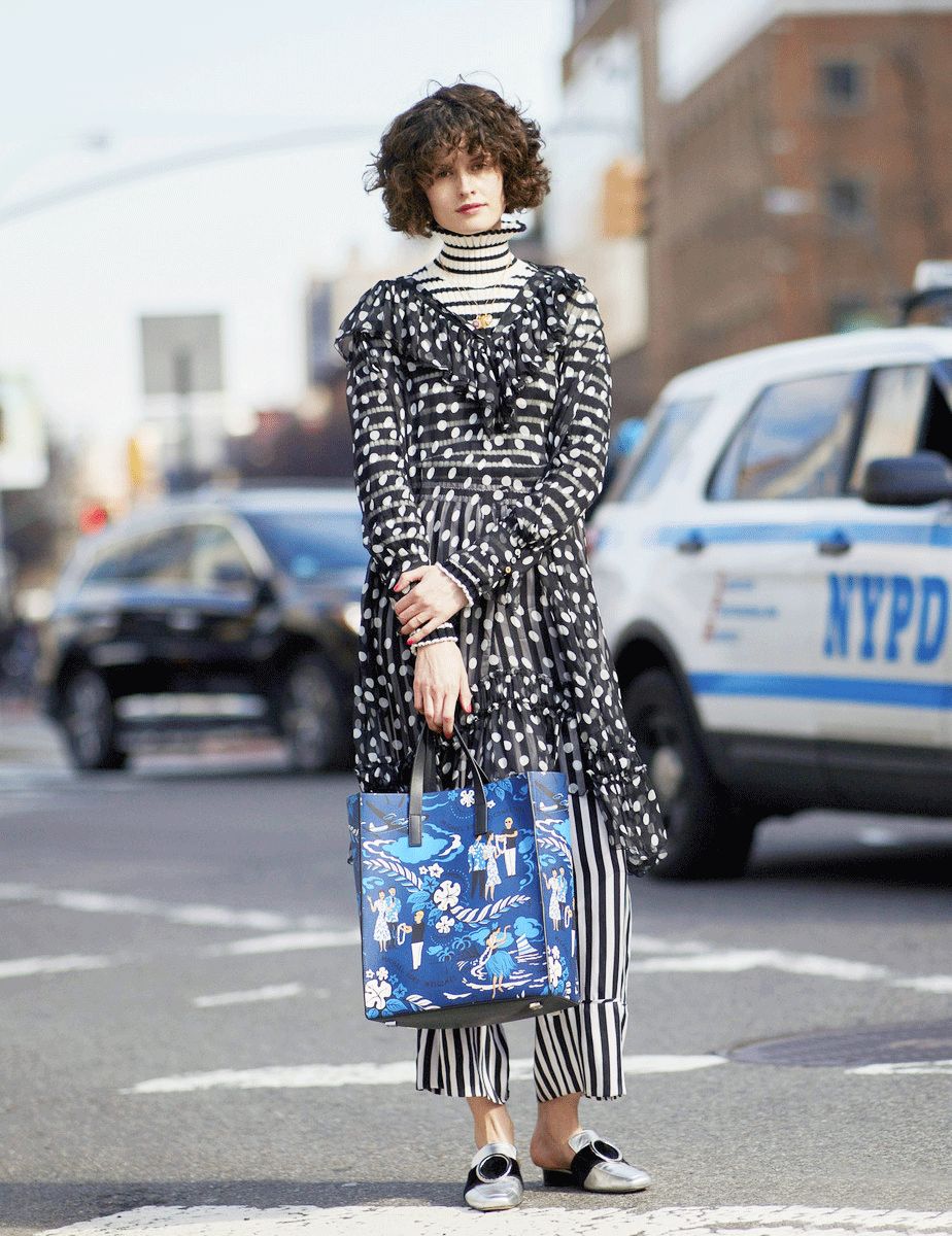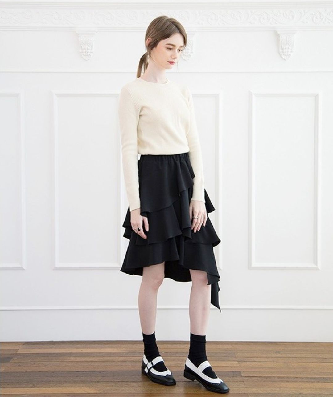 另外像这双简单到极致的穆勒鞋我也很推荐,鞋带黑白相间,有种性冷淡美感,还不单调。但更重要的是我发现模特搭配条纹袜子再穿它,造型就变得非常有趣。建议买了后可以尝试搭配不同的条纹袜过过瘾,说不定有惊喜。