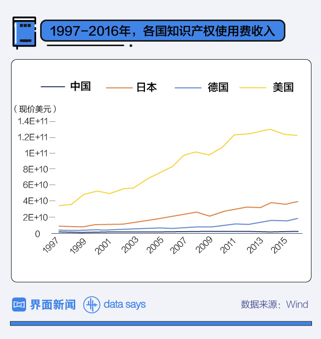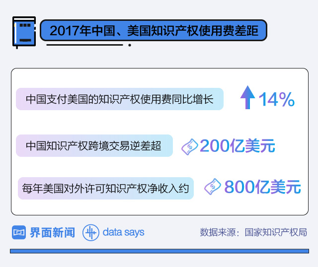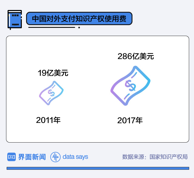 中国知识产权相较其他国家仍有较大差距。2017年,中国对外支付的知识产权使用费逆差超过200亿美元。而美国每年对外许可知识产权净收入金额都近800亿美元。
