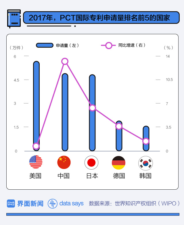 另据,世界知识产权组织(WIPO)公布消息称,2017年中国提交的PCT国际专利申请量首次排名全球第二。在PCT国际专利申请量前15的原属地中,仅有中国和印度是两个中等收入国家。且2017年中国发明专利申请量达138.2万件,连续7年位居世界首位。