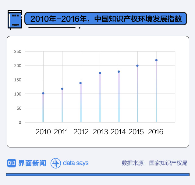 中国知识产权环境发展指数从2010年的100分提至2016年的216.9分。2017年中国进一步修订《反不正当竞争法》,加强对商业秘密的保护,美国知识产权权威人士和有关媒体也表示,中国的知识产权保护环境得分居于中等收入国家前列。