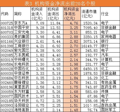 机构资金净流出超过2亿元个股有9家,分别为京东方A(4.76亿元)、中国平安(3.25亿元)、三安光电(3.11亿元)等。