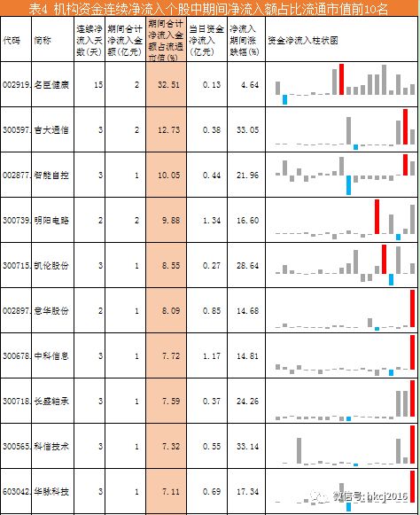 名臣健康、吉大通信、智能自控等个股受到机构资金的持续净买入,其中名臣健康连续15个交易日受到机构资金的净买入,期间净流入共计32.51亿元,涨幅为4.64%。
