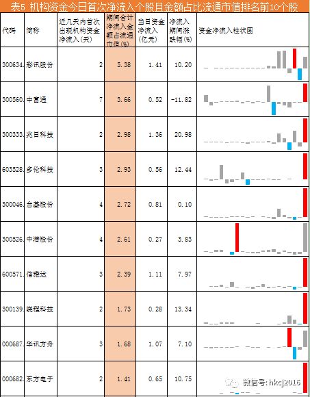 表 5 所示机构资金在近日首次出现净买入的各股,其中中富通(300560)为近7个交易日内首次出现机构资金净流入,今日净流入0.52亿元,近7个交易日内机构资金净流入占流通市值3.66%,占比较高,近7个交易日内涨跌幅为-11.82%,今日涨幅为8.56%。