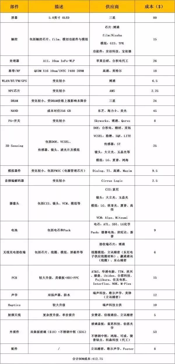 在每次新款iPhone发布之后,这套理论就会大放异彩。诸如此前的iPhone X,在其发布之后,国外知名数据研究公司Techlnsights给出了iPhone X的硬件成本报告,数据显示:iPhone X64G版本的硬件成本为357.5美元;256G版本的元器件成本价格可能在417.25美元左右。