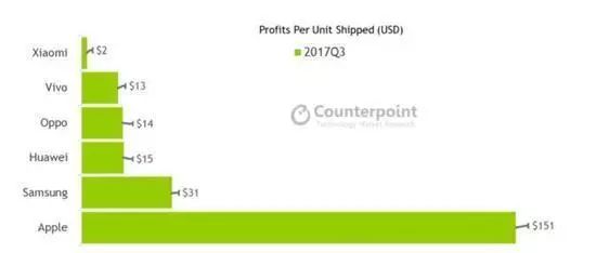 而这个数据,与市场调研Counterpoint公布的数据有着一定的一致性,此前市场调研Counterpoint公布的2017年第三季度各手机厂商的利润数据显示,苹果手机单台的利润达到了151美元。