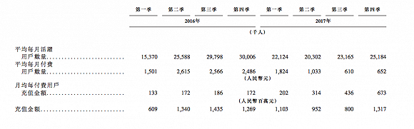 不过,也有映客员工告诉界面记者,映客的头部主播名气和粉丝大都积聚在映客体系内,对平台依赖性很强,因而流失并不严重。体现在招股书上,就是相对乐观的月均付费用户充值金额,在月均付费用户数量不断下降的情况下,该项数据在2017年各个季度始终保持着环比增长,映客对此的解释是“能维持一群高消费付费用户,且该群体规模相对稳定。”