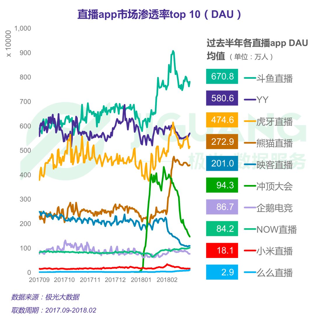 根据极光大数据2017年发布的《APP风云榜(2月榜单)》,腾讯旗下的NOW直播DAU量级逼近300万,从500名开外窜升至123名,成为增长幅度最大的直播平台。