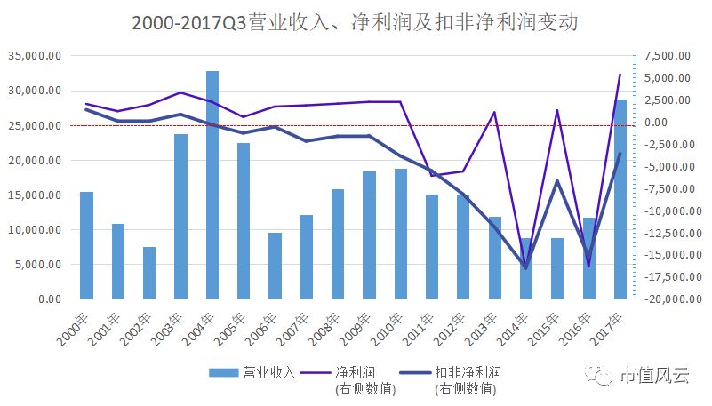 2000-2017年营业收入、净利润及扣非净利润变动如下图:
